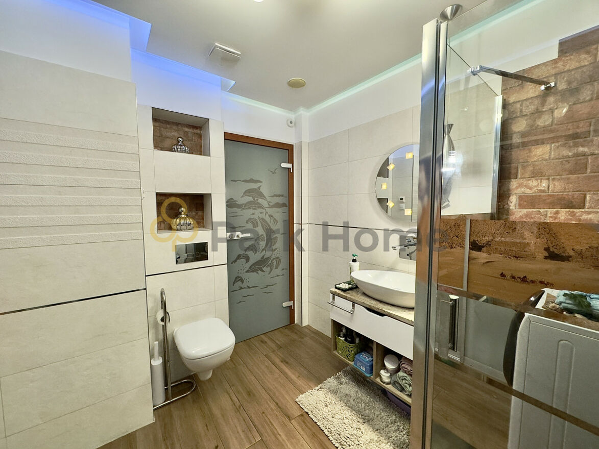 -łazienka z kabiną prysznicową i ogrzewaniem podłogowym,